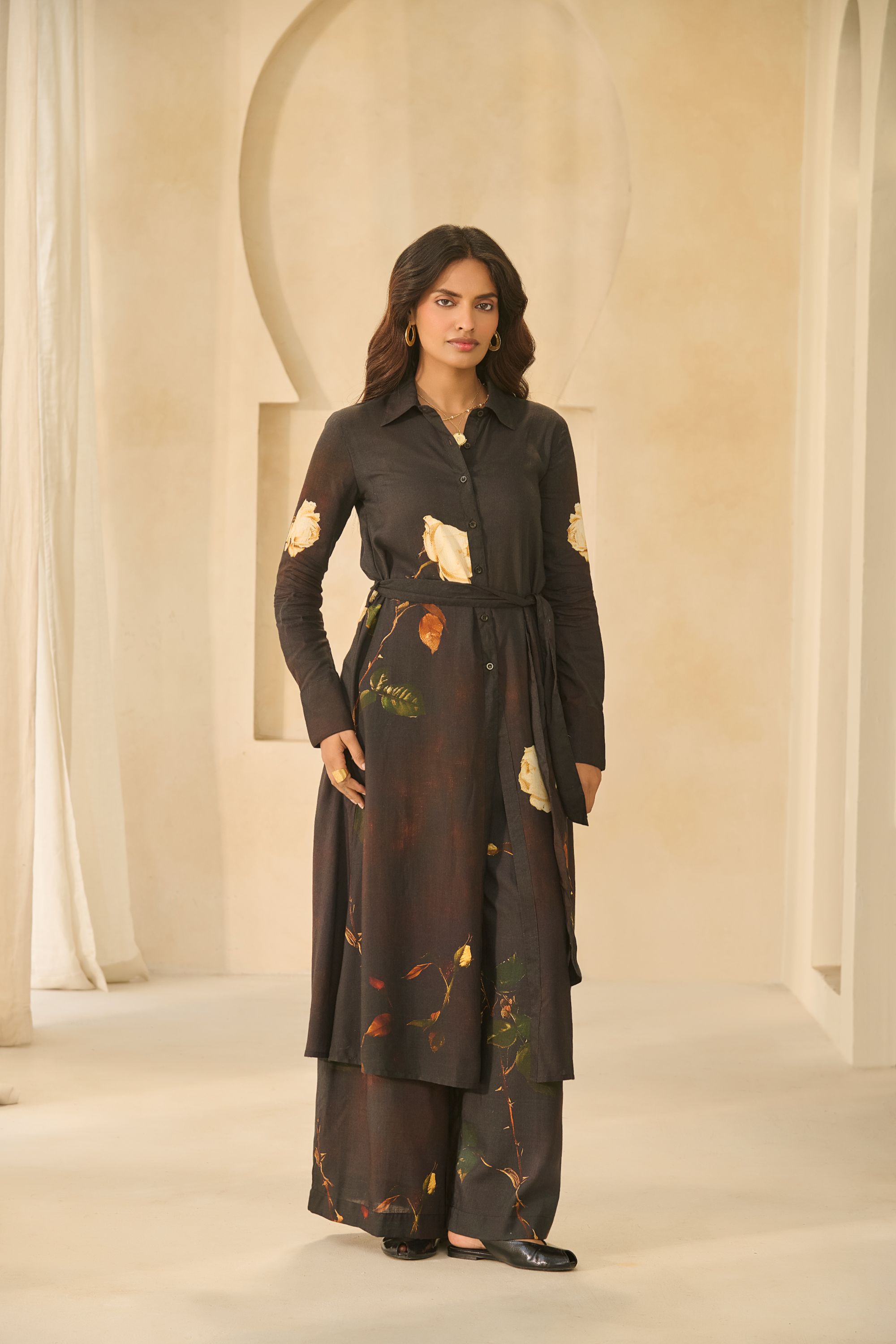 A longline shirt paired with wide-leg trousers in a charcoal floral print. Made from rayon that drapes softly and feels cool to wear.