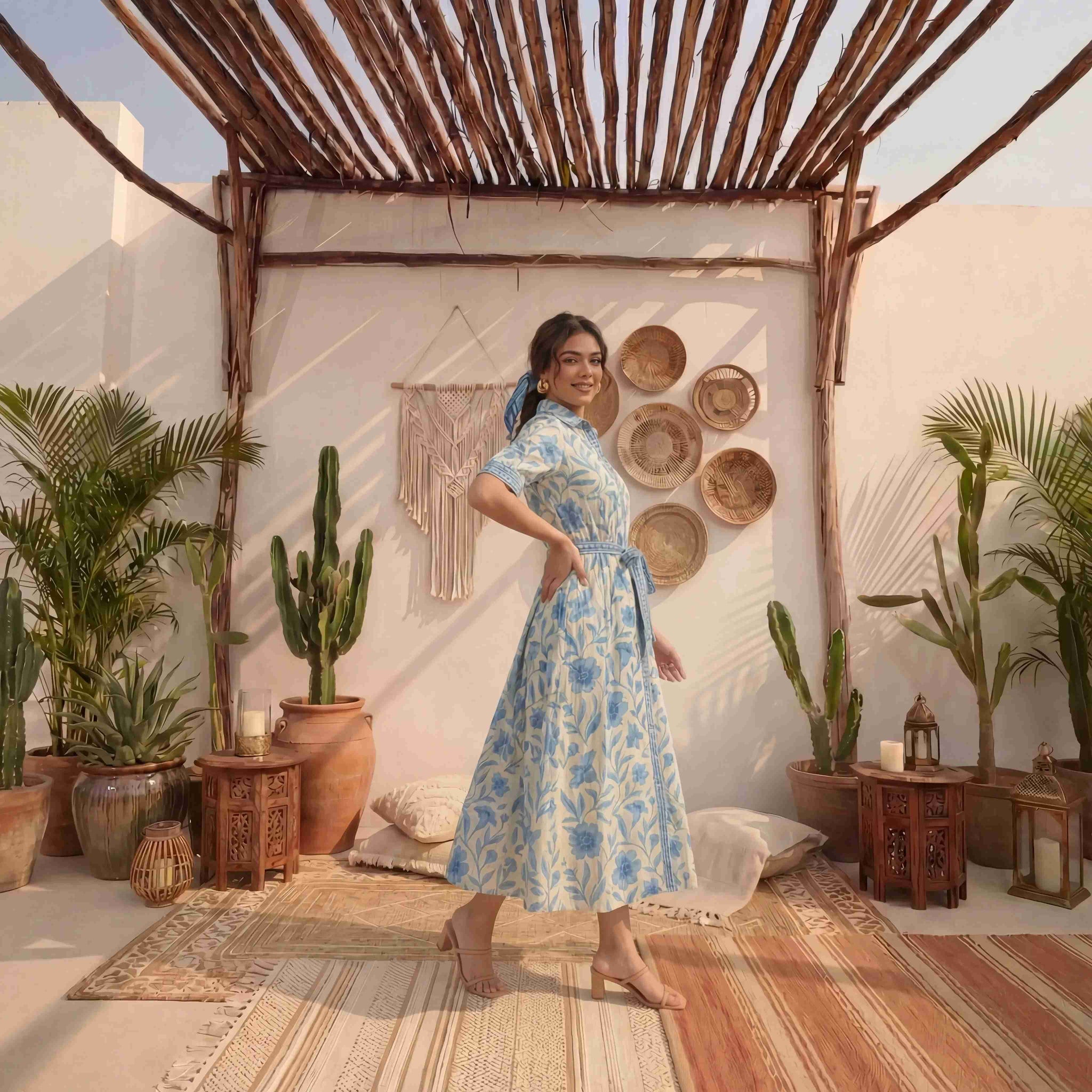 Blue and White Floral Print Cotton Shirt Dress with Belt