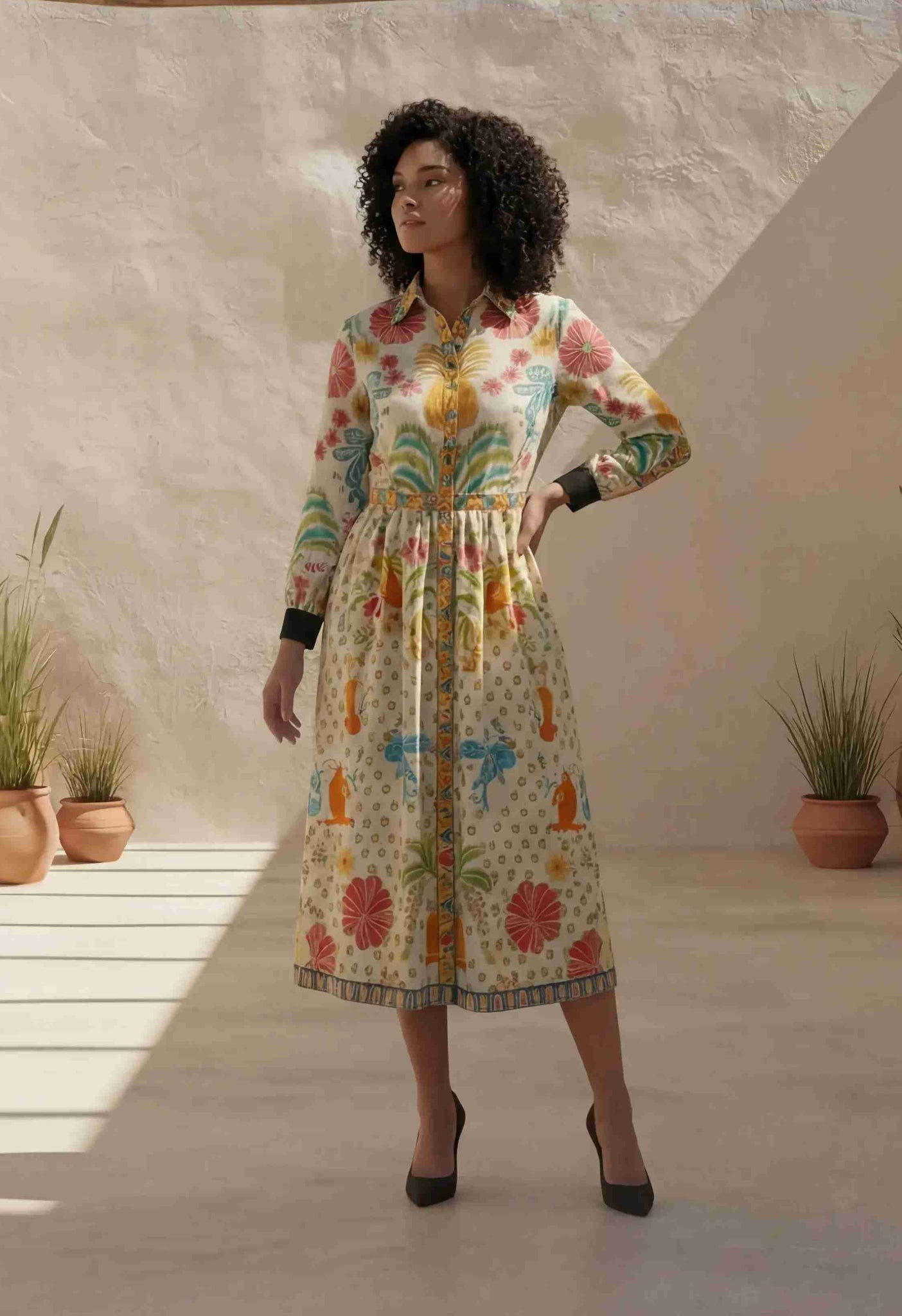 Multi-Color Botanical Print Belted Shirtdress