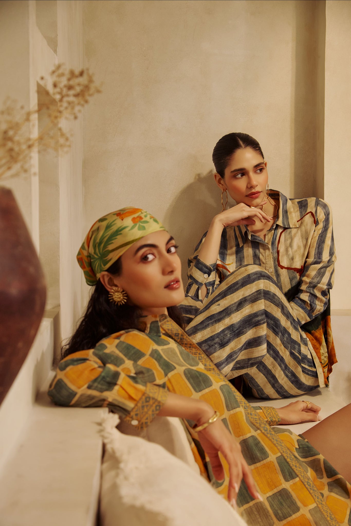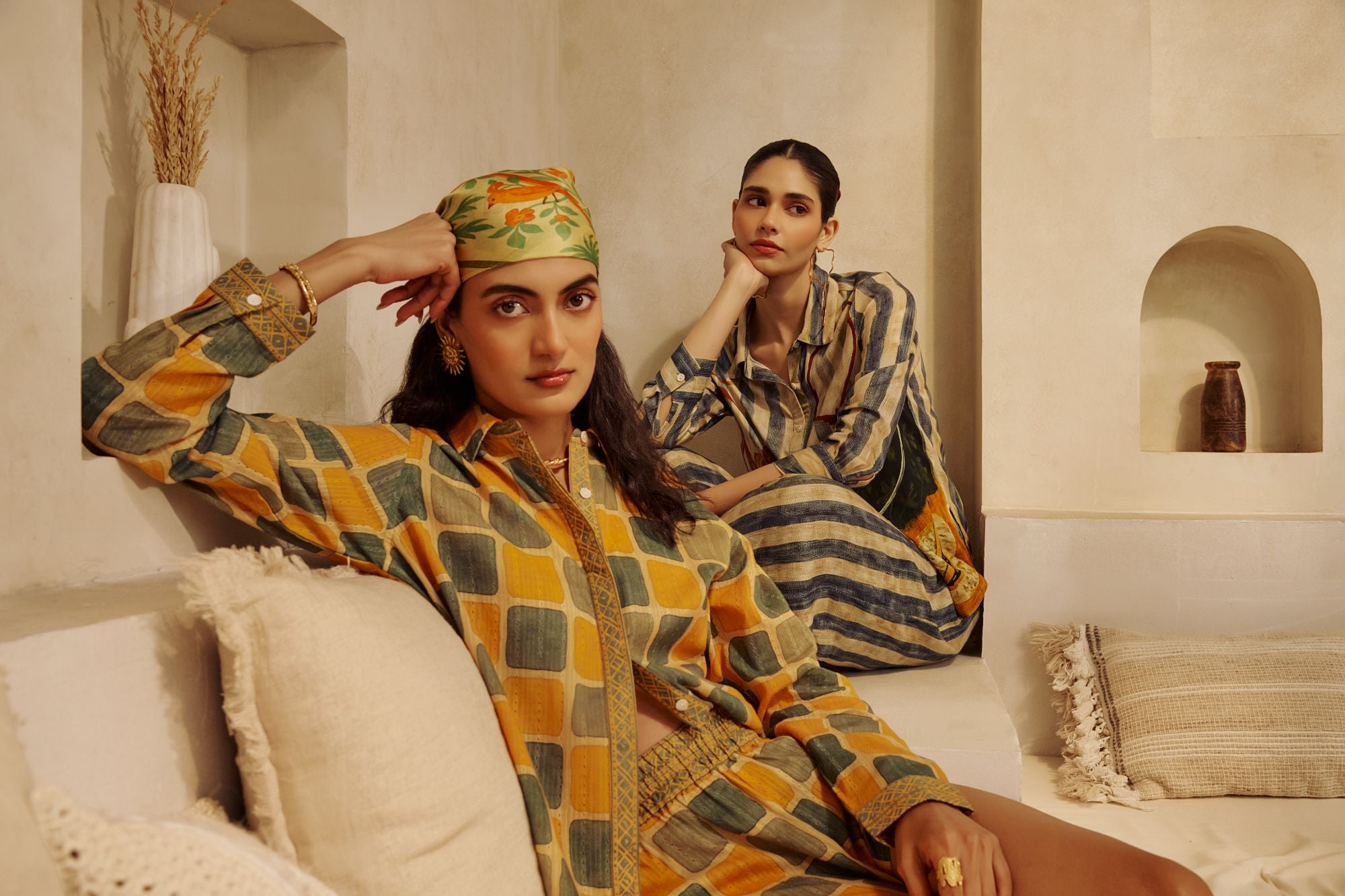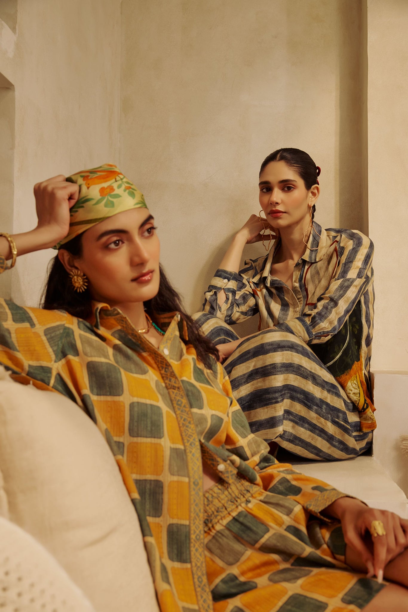 A shirt and trouser set featuring mustard and olive checks. Cotton fabric keeps it comfortable and suitable for warm climates.
